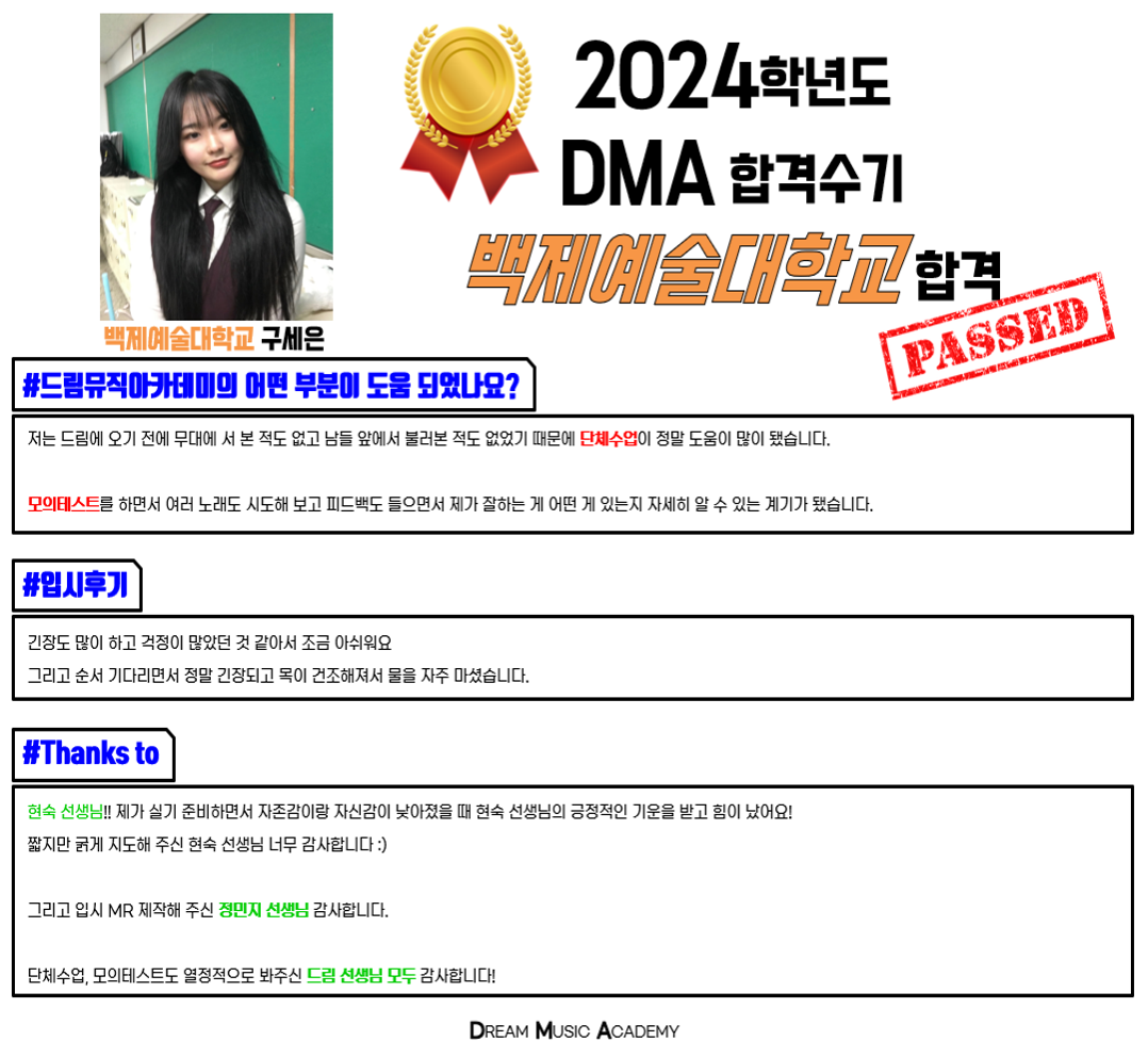 DMA 학생들의 생생한 합격 수기를 확인 할 수 있습니다.
